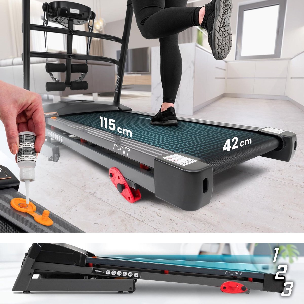 Het ruime loopvlak van 42 × 115 cm biedt voldoende stabiliteit en comfort tijdens elke stap. Dankzij het vetverdelingssysteem blijven alle bewegende onderdelen soepel functioneren, wat de levensduur van jouw loopbandaanzienlijk verlengt. Regelmatig onderhoud is eenvoudig, want het speciale smeermiddel wordt meegeleverd.