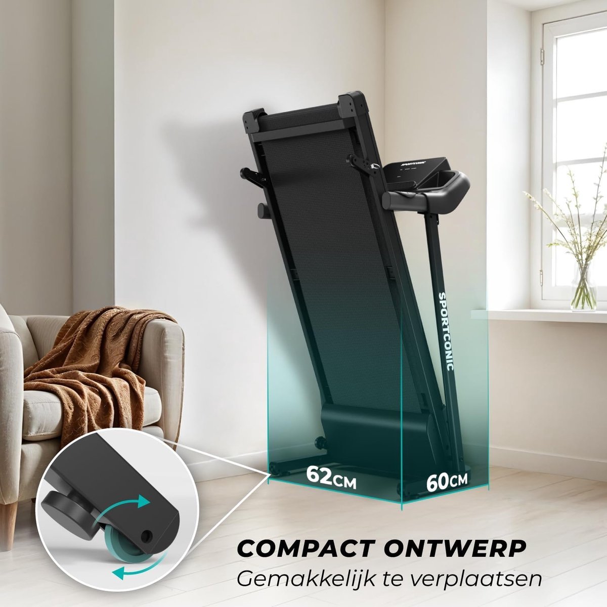 Opvouwen: Na gebruik kun je de loopband eenvoudig inklappen, zodat je hem compact kunt opbergen. Gebruik de transportwielen om de loopband naar een geschikte opbergruimte te verplaatsen, zodat deze geen ruimte in je huis in beslag neemt wanneer je hem niet gebruikt.
