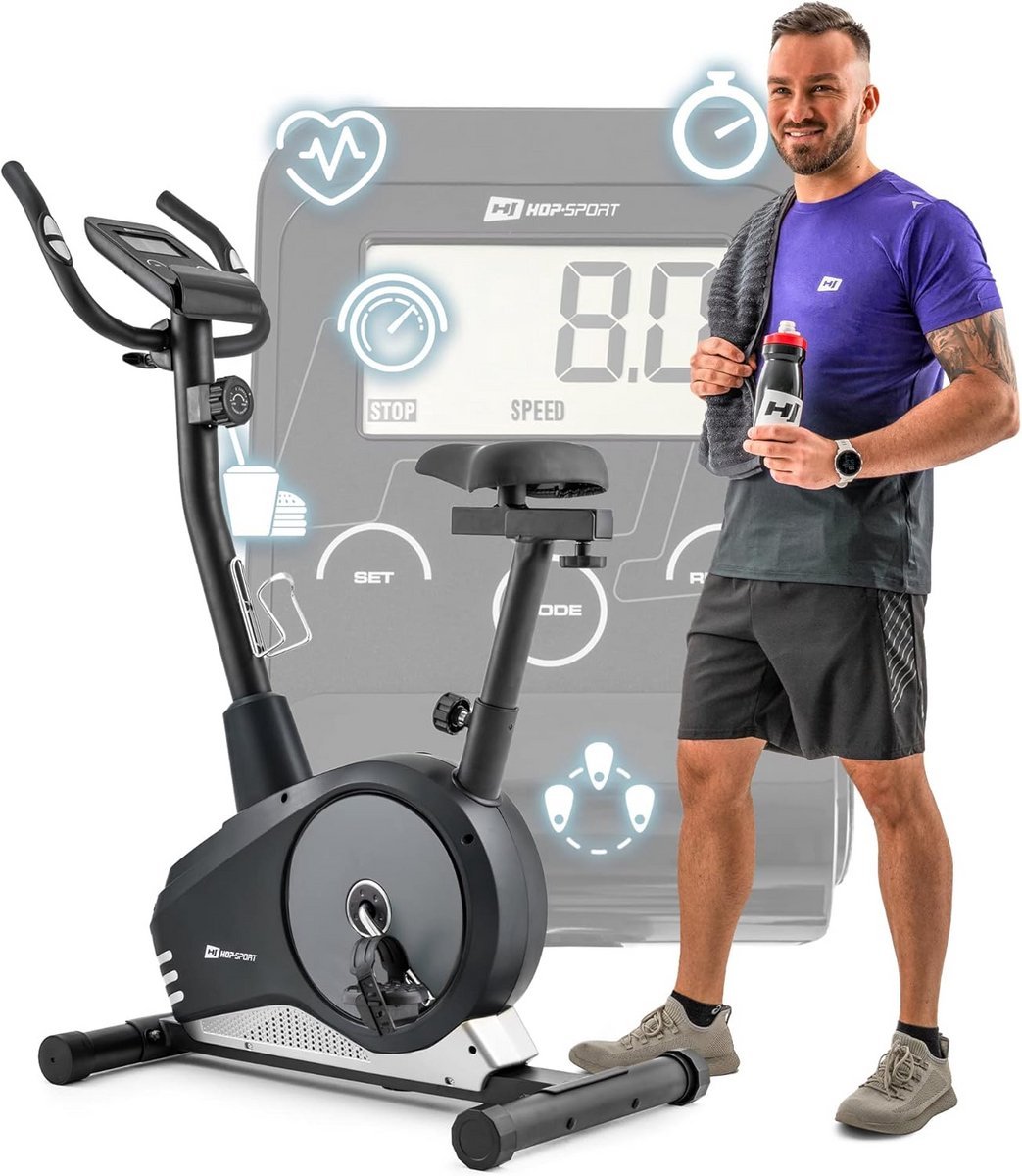 Deze magnetische hometrainer is ideaal voor zowel recreatieve sporters als mensen die hun conditie willen verbeteren en calorieën willen verbranden. De fiets beschikt over gevoelige pulssensoren in de handgrepen waarmee u uw hartslag eenvoudig op het LCD-scherm kunt aflezen. De zitting is zowel verticaal als horizontaal verstelbaar voor een perfecte pasvorm. Ook de hellingshoek van het stuur is aanpasbaar voor maximaal comfort. De antislip pedalen met vergrendelingsriemen zorgen ervoor dat uw voeten veilig op hun plaats blijven tijdens intensieve trainingen. De trainingscomputer toont snelheid, afstand, trainingstijd, verbrande calorieën en hartslag. Dankzij de SCAN-functie wisselen deze parameters automatisch. Het stille magneetsysteem met 8 instelbare weerstandsniveaus (vliegwielgewicht 9 kg) zorgt voor een efficiënte en professionele training thuis. (EAN: 9101058713711)