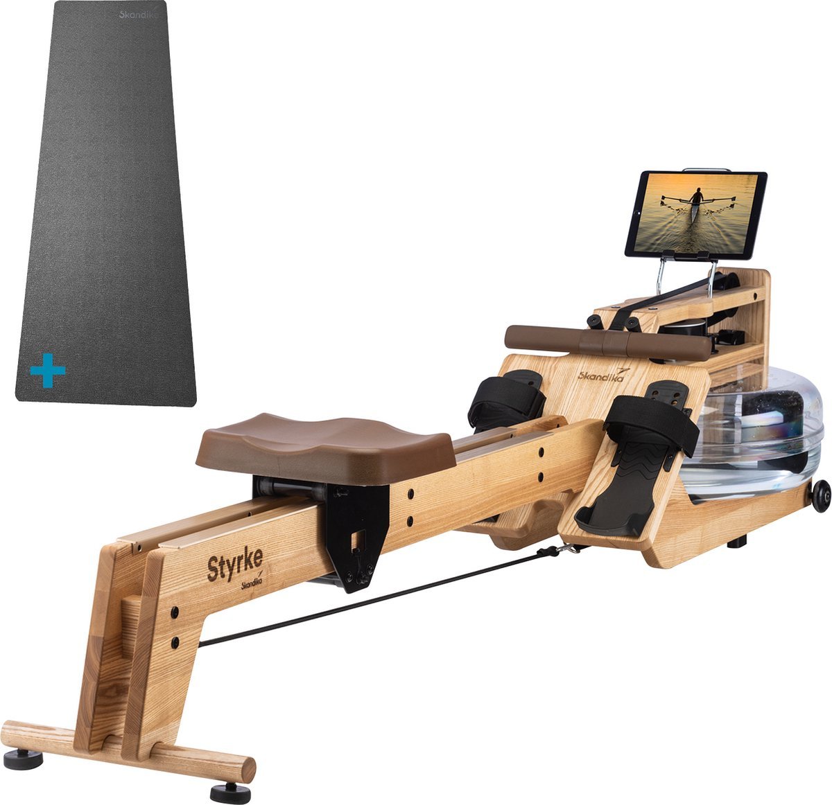 Skandika Styrke Roeitrainer SET – Roeitrainers – Roeiapparaat (211 x 54 x 47cm) + Mat (65 x 230cm) – Echt essenhouten waterroeier, regelbare waterweerstand, waterroeiapparaat thuis, gebruiker tot 200 cm/180 kg – Made in Germany – klassiek hout/bruin (4262393517329)
