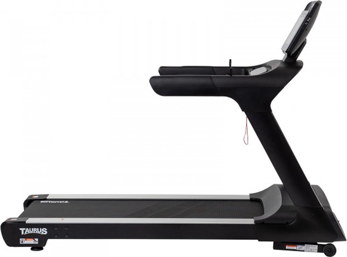 De Taurus Loopband T9.9 Touch heeft ook een Bluetooth-interface waarmee je hem kan verbinden met de trainingsapps iConsole + Training en Kinomap. Met deze apps kan je trainen met de trainingsvideos van andere gebruikers of met een van de vele trainingsprogrammas. Taurus Loopband T9.9 Touch met hoogwaardige functies De Taurus Loopband T9.9 Touch is uitgerust met een groot loopoppervlak van 157 x 56 cm, een krachtige DC-motor met een constant vermogen van 3,5 PK en een 15,6 inch touchscreenconsole en biedt je een aangename en effectieve looptraining! Zeer aangename looptrainingtitle De Taurus Loopband T9.9 Touch heeft een groot loopoppervlak van 157 x 56 cm, waardoor mensen met uiteenlopende lichaamslengtes veilig en comfortabel kunnen trainen, ook bij zeer hoge snelheden. De loopband heeft een eenvoudige bediening. Met 8 directe keuzetoetsen en de grote knoppen op de armleuningen kan je de snelheid en het stijgingspercentage zowel voor als tijdens de training wijzigen. De snelheid kan worden verhoogd in stappen van 0.1 km/u en het stijgingspercentage in stappen van 1%. Een uitdagende heuvelloop op een vlakke ondergrond De T9.9 Touch heeft een krachtige DC-motor met een constant vermogen van 3.5 PK, die ervoor zorgt dat de loopband soepl en gelijkmatig wordt aangedreven. De loopband heeft een maximumsnelheid van maar liefst 22 km/u zodat ook zeer ervaren sporters voldoende trainingsuitdaging hebben. Het stijgingspercentage kan tot 15% worden verhoogd, waardoor je op de vlakke ondergrond van de loopmat een uitdagende heuvelloop kan afleggen. Zeer natuurlijke trainingsbeweging Dankzij de zeer goede demping voelt de training op de T9.9 Touch aan alsof je op een bospad loopt. De hoogwaardige dempingselementen zorgen er in combinatie met de 3,1 mm dikke loopmat voor dat je gewrichten en pzen tijdens het hardlopen minimaal worden belast en de trainingsbeweging zeer naturlijk verloopt. De loopmat dempt het geluid dat vrijkomt tijdens de training optimaal en zorgt voor een soepele en aangename trainingsbeweging. De Taurus T9.9 Touch is geschikt voor (semi)-professioneel gebruik Dankzij de solide afwerking en de hoge stabiliteit is de T9.9 Touch geschikt voor (semi)-professioneel gebruik in bijvoorbeeld e sportschool, hotels, bedrijfsgyms en thuis. Doordat de loopband een lage startsnelheid heeft van 0,5 km/u kan hij ook worden gebruikt voor therapeutische doeleinden, zoals fysiotherapie en revalidatie. De snelheid kan in kleine stappen van 0.1 km/u worden verhoogd zodat je je trainingsniveau in je eigen tempo op kan bouwen. De loopband heeft een lage instap zodat je makkelijk op,- en af kan stappen. De loopband kan worden uitgebreid met extra armleuningen voor optimale stabiliteit bij evenwichtsproblemen, een lichamelijke handicap of hersteltraining na een verwonding of blessure. 3 uitblinkers: een 15,6 inch touchscreen | een loopoppervlak van 157 cm | een DC-motor met een constant vermogen van 3,5 PK